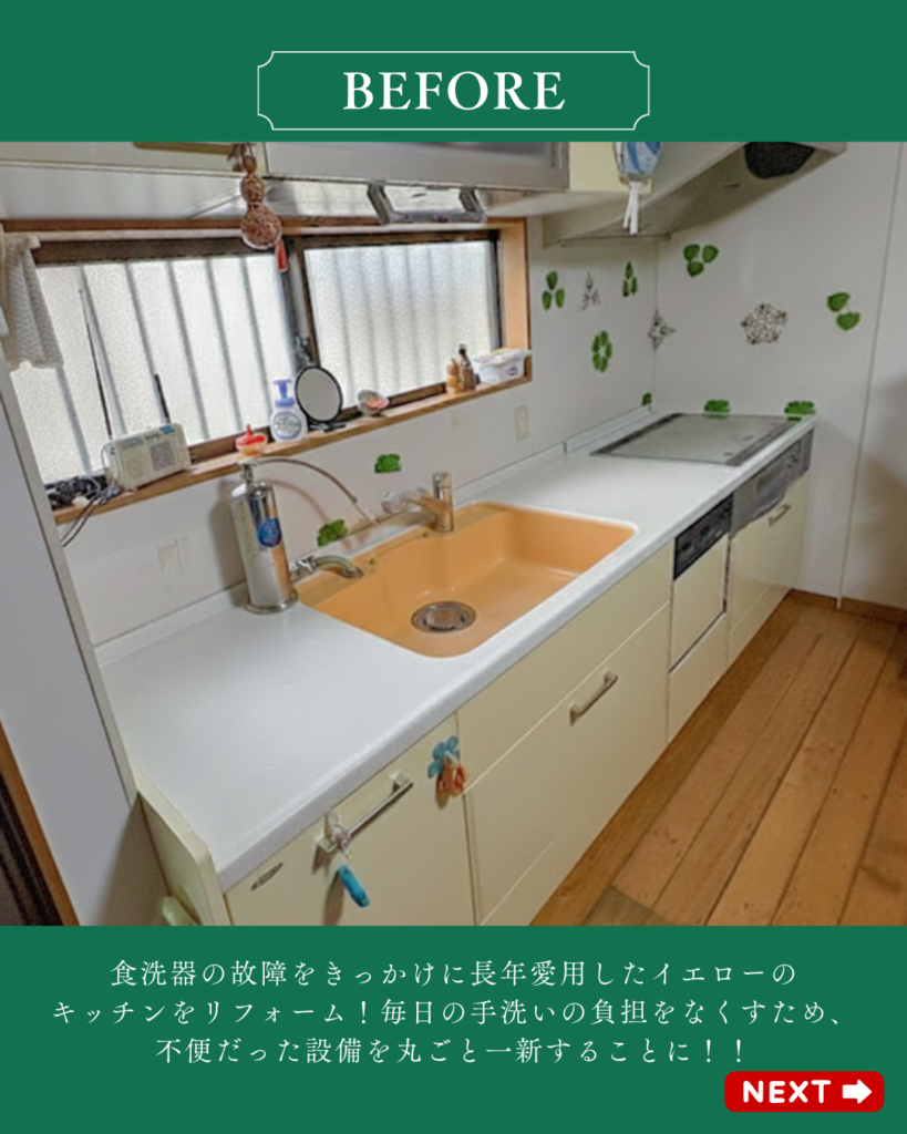 リフォーム前は、優しいイエローの扉が印象的なキッチン。大切に使われてきましたが、食洗機が使えなくなったことで、毎日の手洗いが大きな負担になっていました。「不便な設備を我慢して使い続けるよりも、この機会にまるごと一新して、もっと家事が楽しくなる場所にしたい!」 そんなお施主様の想いから、今回のプロジェクトがスタートしました。
