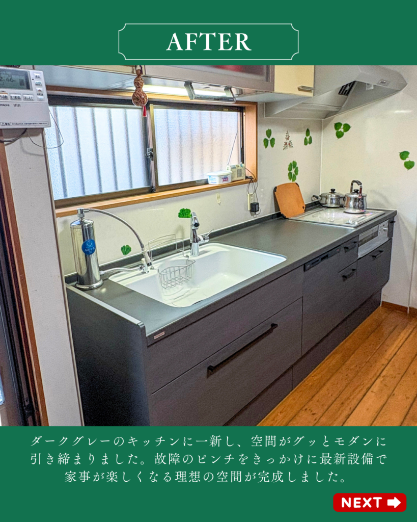 「壊れたから直す」だけでなく、「より快適な暮らしに変える」。 今回のリフォームでは、故障のピンチをきっかけに、家事が楽しくなる理想のキッチン空間が完成しました。