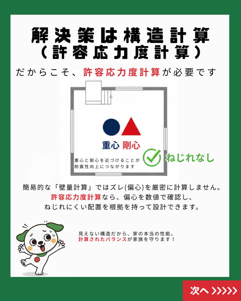 一般的な「簡易的な壁量計算」では、このズレ(偏心)を厳密には計算しません。 一方で、許容応力度計算を行えば