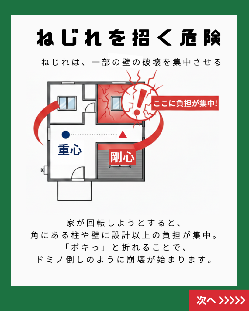 重心と剛心がズレている(偏心している)と、地震の際、特定の角の柱や壁に設計以上の負担が集中します。 1箇所の壁が「ポキっ」と折れてしまうと、そこからバランスを崩し、ドミノ倒しのように一気に崩壊が進んでしまうのです。