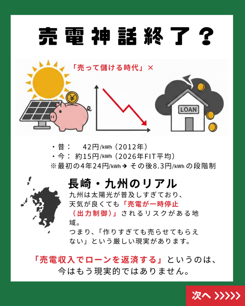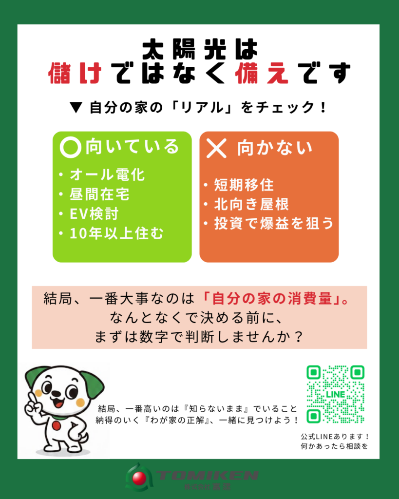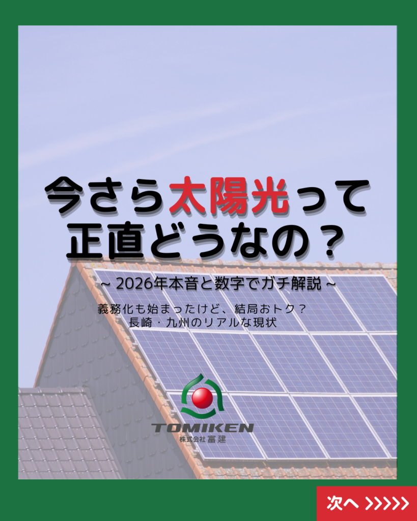 「太陽光パネル、昔は儲かったみたいだけど今はどうなの?」 長崎・九州エリアのお客様から、最近このようなご相談をよくいただきます。 結論から申し上げます。太陽光は「儲け」ではなく「備え」として、今こそ検討すべき価値があります。