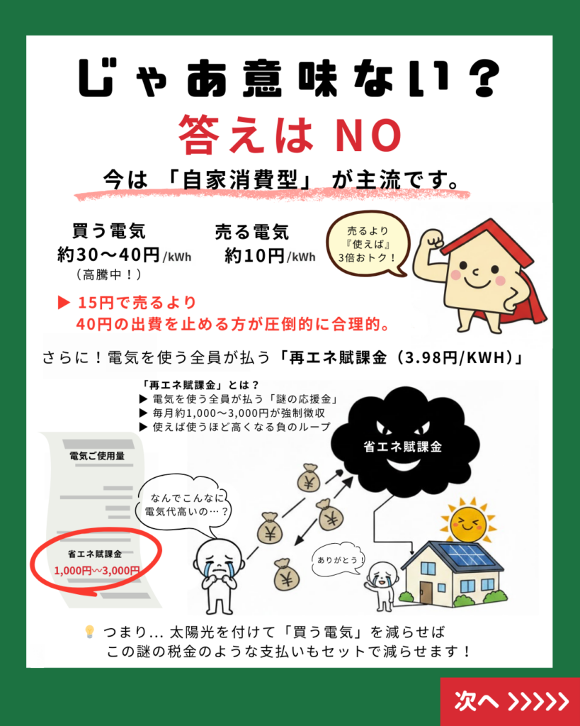 15円で売るよりも、40円で買う電気を止める(自家消費する)方が、圧倒的に合理的。 今は、作った電気を「売る」より「自分で使う」のが一番おトクな時代なんです。