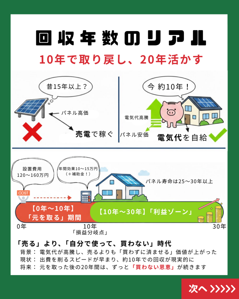 「元を取るのに20年かかるのでは?」という不安もありますが、実は今、パネル価格の下落と電気代高騰により、約10年での回収が現実的になっています。 設置から10年で元を取り、その後の20年間は「電気をタダで作れる利益ゾーン」が続く。これが令和の太陽光モデルです。
