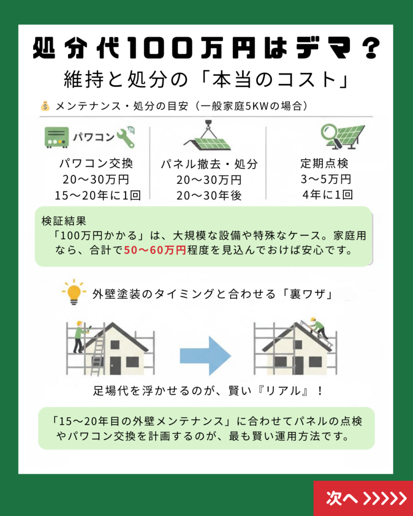 「処分に100万円かかる」という噂がありますが、一般的な家庭用(5kW程度)であれば、撤去・処分費用は20〜30万円程度が目安です。 さらに、外壁塗装のタイミング(足場がある時)にメンテナンスを合わせるといった「裏ワザ」を使えば、コストを賢く抑えることも可能です。
