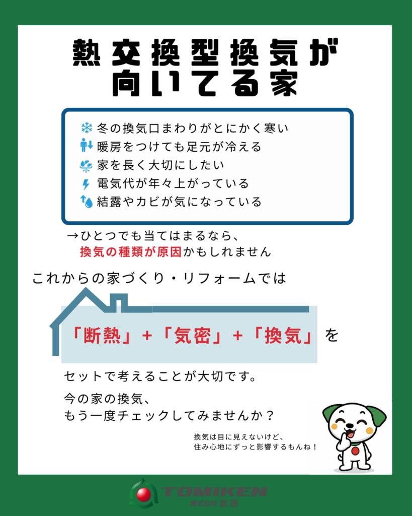これからの住まいづくりやリフォームでは、「断熱」+「気密」+「換気」をセットで考えることが、長く快適に住み続けるための鍵となります。