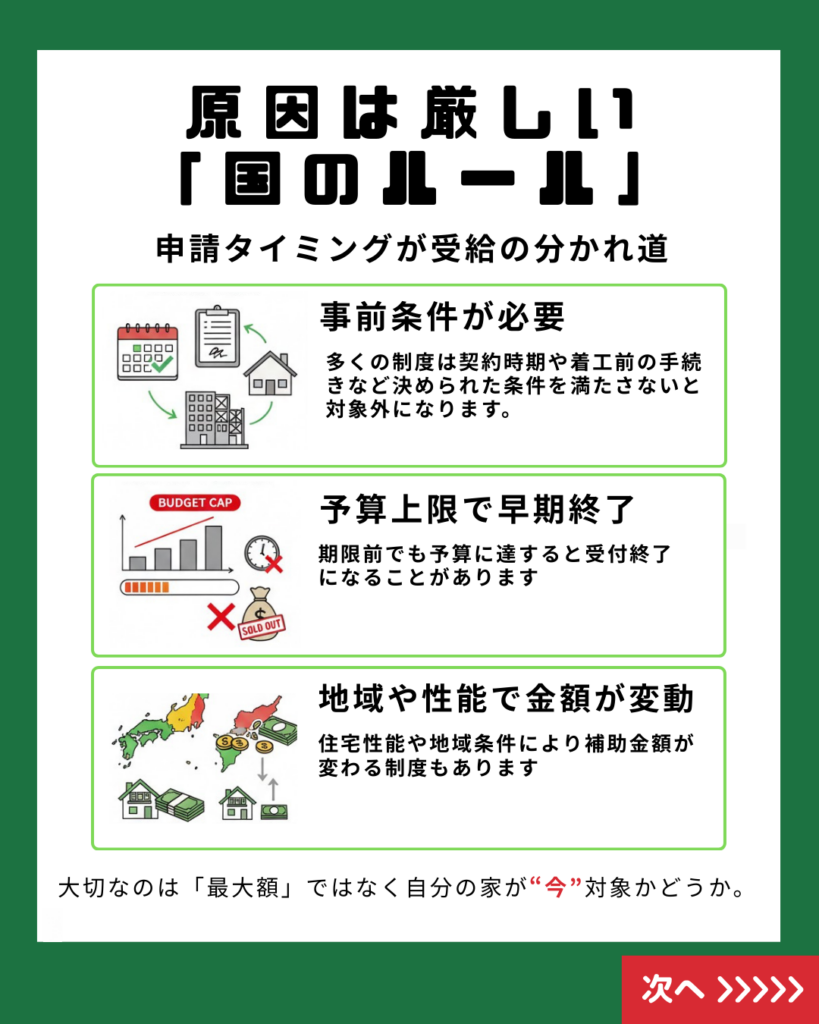 住宅補助金には、意外と知られていない厳しい国のルールがあります。 せっかくのマイホーム計画やリフォームで、もらえるはずの数十万〜100万円以上のお金を逃してしまわないよう、大切なポイントをまとめました。