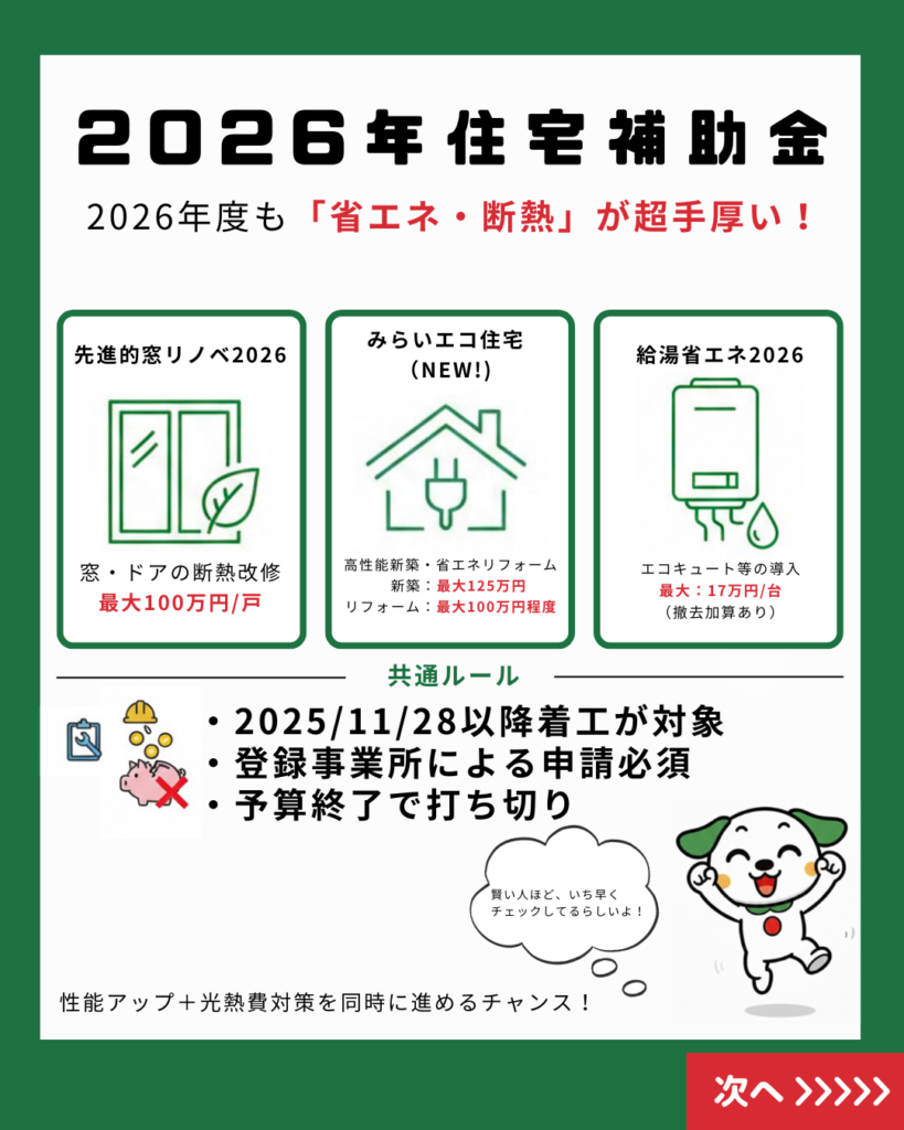 2026年度も、省エネ・断熱リフォームへの支援が非常に手厚くなっています。